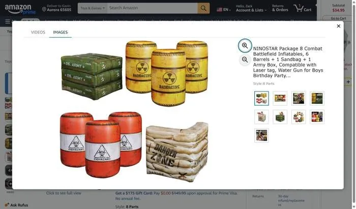 NINOSTAR 8-Piece Combat Battlefield Inflatables — 6 barrels, 1 sandbag, 1 army box. Compatible with laser tag and water guns. Requires air pump to inflate (included in Battle Zone package or rent separately). You can rent 1 or both sets.